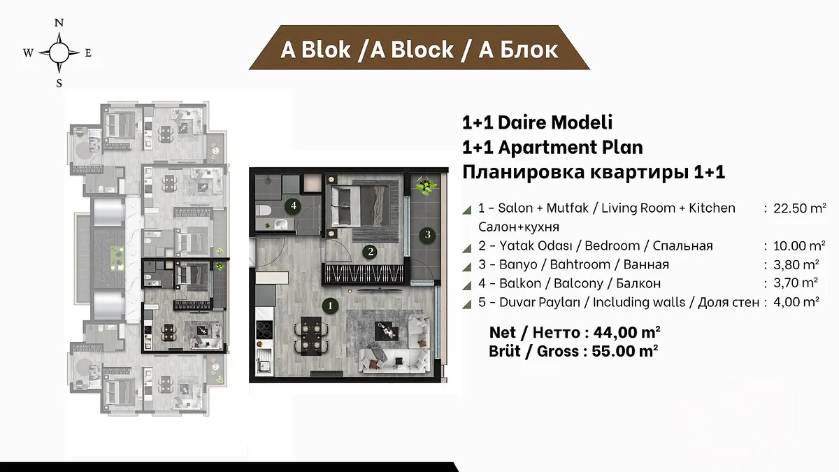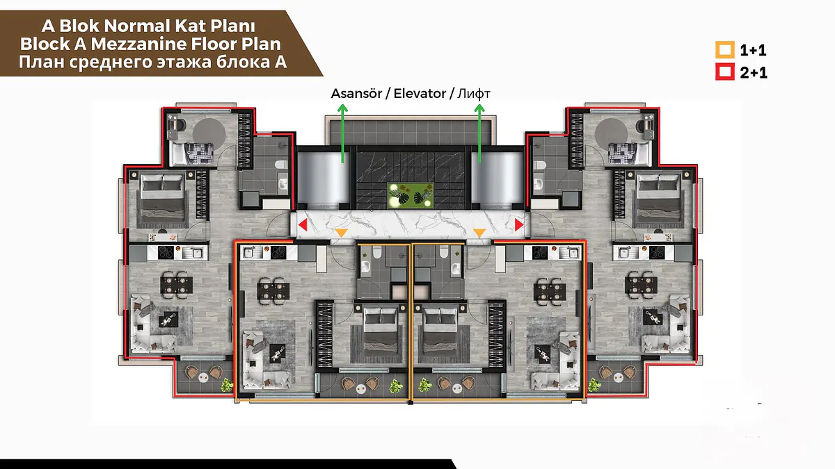 The flats for sale in Antalya are 150 m from the bus stop, 600 m from the market, 1.5 km from Antalya City Hospital, 5 km from Antalya Bus Station and the tram stop, 7 km from Özdilek Shopping Mall, 9 km from Akdeniz University, 10 km from MarkAntalya Shopping Mall, 11 km from Kaleiçi, 11 km from Konyaaltı Beach, and 18 km from Antalya Airport.