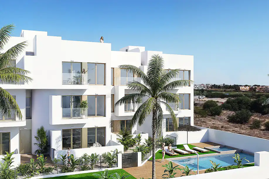 This modern complex is designed around communal green spaces, with a large shared swimming pool at its heart. Residents benefit from secure covered parking, storage rooms, and well-planned walkways. The apartments feature terraces on both sides, solariums, and panoramic views of the golf course and Mar Menor, creating an inviting outdoor living experience.
